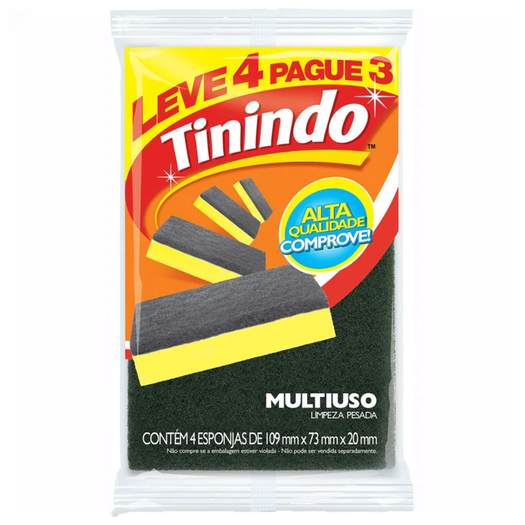 A Esponja Multiuso Tinindo Leve 4 Pague 3 é ideal para limpeza eficiente de louças, utensílios e superfícies em geral.